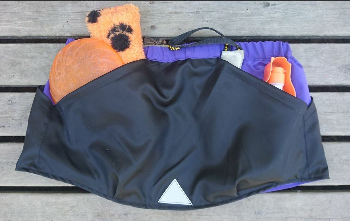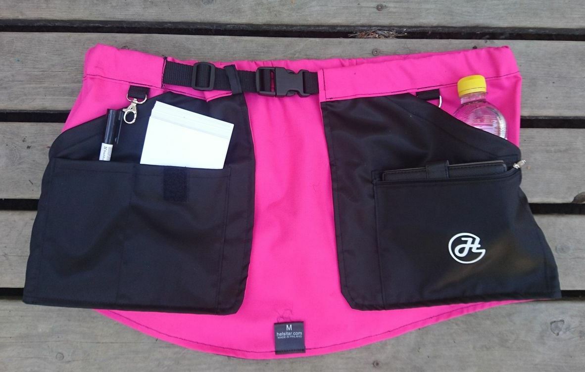 Taskuun mahtuu mukaan niin kännykkä, noutokapulaa, naksutin, pilli, motivointipatukkaa, lelua, nameja kuin dameja, nosework-välineitä, jälkiesineitä.... mitä vain juuri sinulle ja koirallesi treenaamiseen tarvitaan.