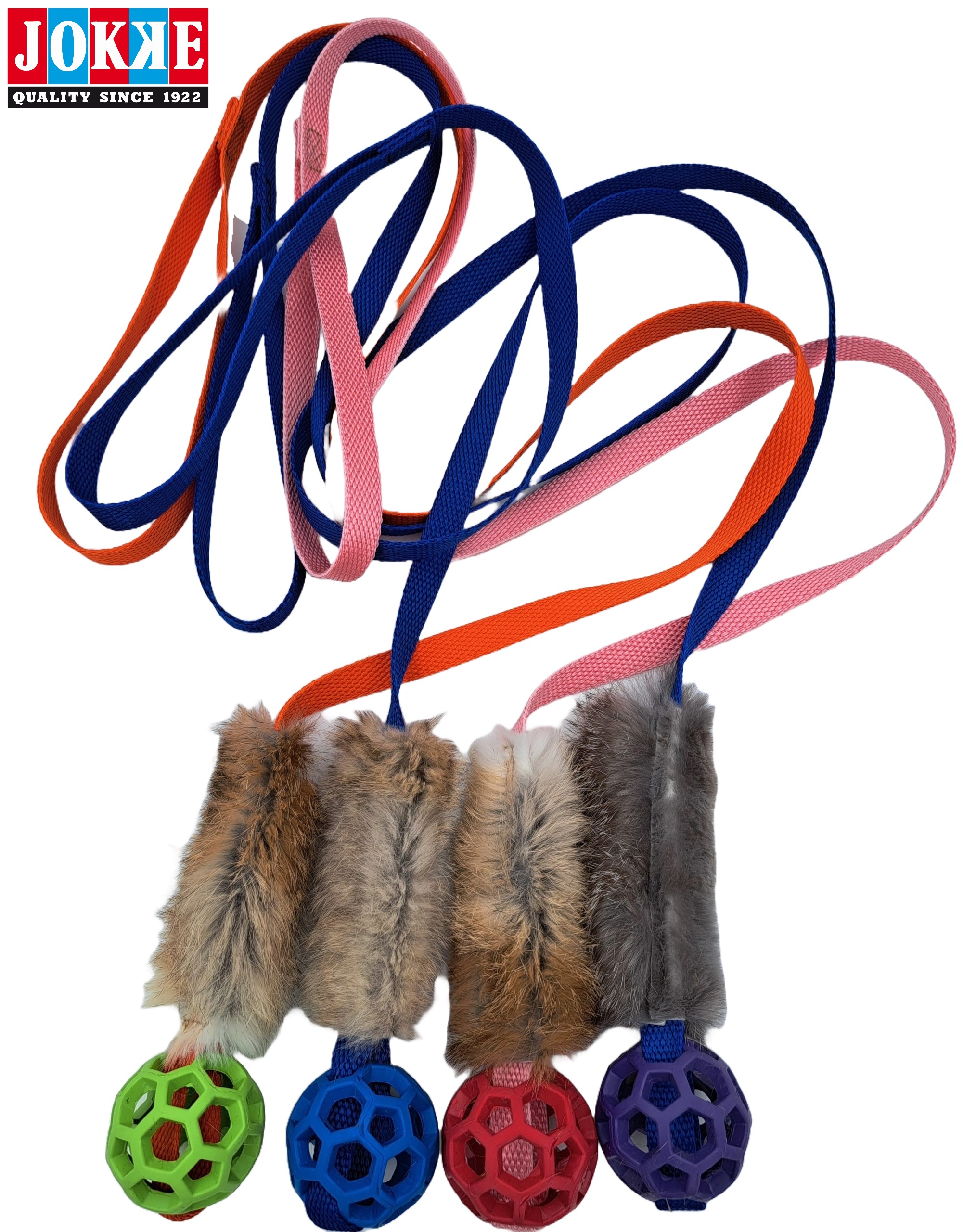 Tämä lelu sopii erityisesti pienille koirille hauskoihin jahtausleikkeihin! Pitkän saalisnauhan päässä on houkutteleva kaninkarva sekä pieni JW verkkopallo (pallon halkaisija 5cm). Lelun koko pituus n. 110cm, josta kaninkarvaosuus noin 10cm x 15mm. Värivalikoima.